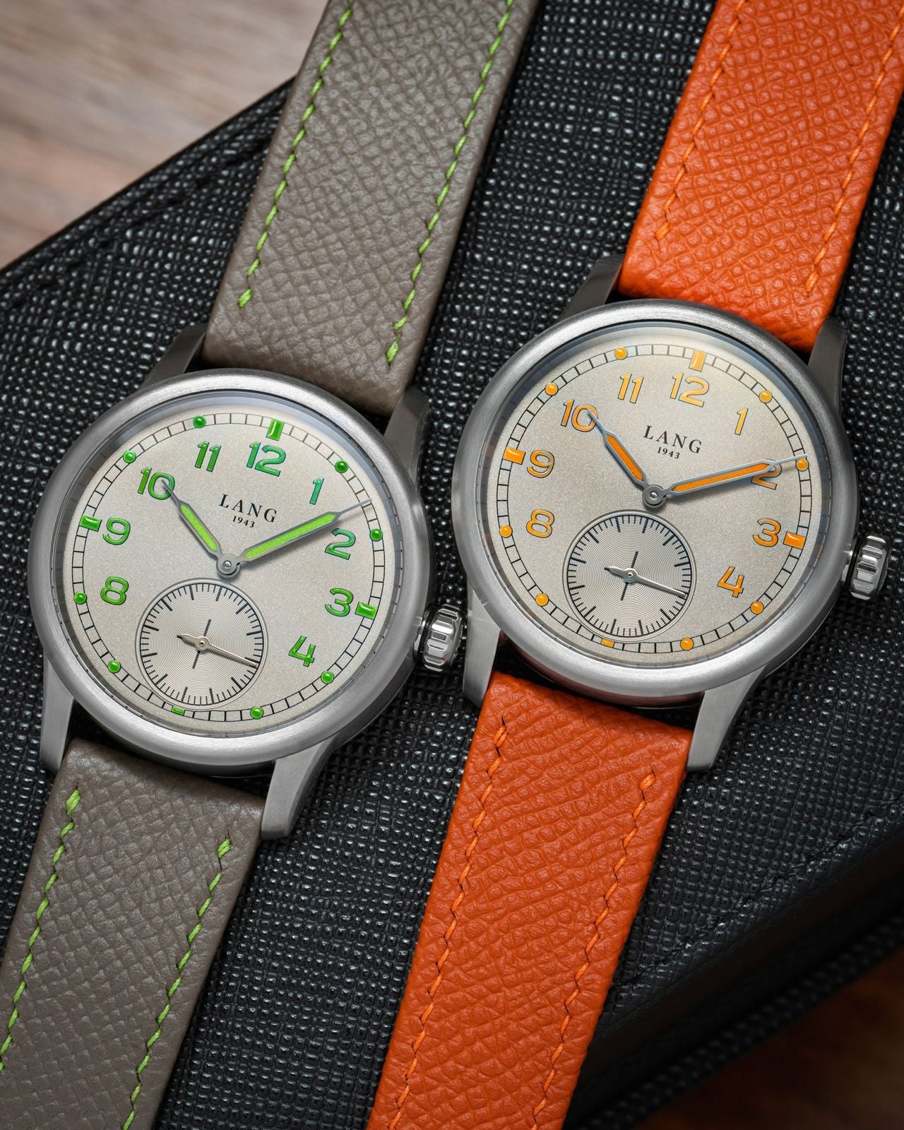 The Retro Collection walks the fine line between cool and vintage, allowing us to relive the 1980s through the vibrant neon colors that were popular during that period. The LANG 1943 signature design has been infused with a touch of nostalgia, taking us on a journey through our fondest memories. The lime green and orange neon numerals, made from Swiss Super-LumiNova, stand out against the light grey sandblasted and rhodium-coated dial.