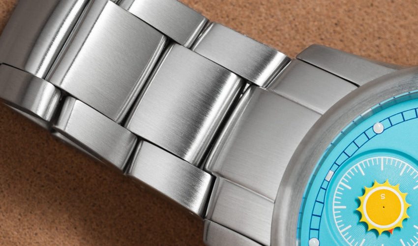 A yellow alligator skin strap with sky blue alcantara lining, as well as a solid stainless steel bracelet in brushed finish with easy extension system - both with quick-release spring bars